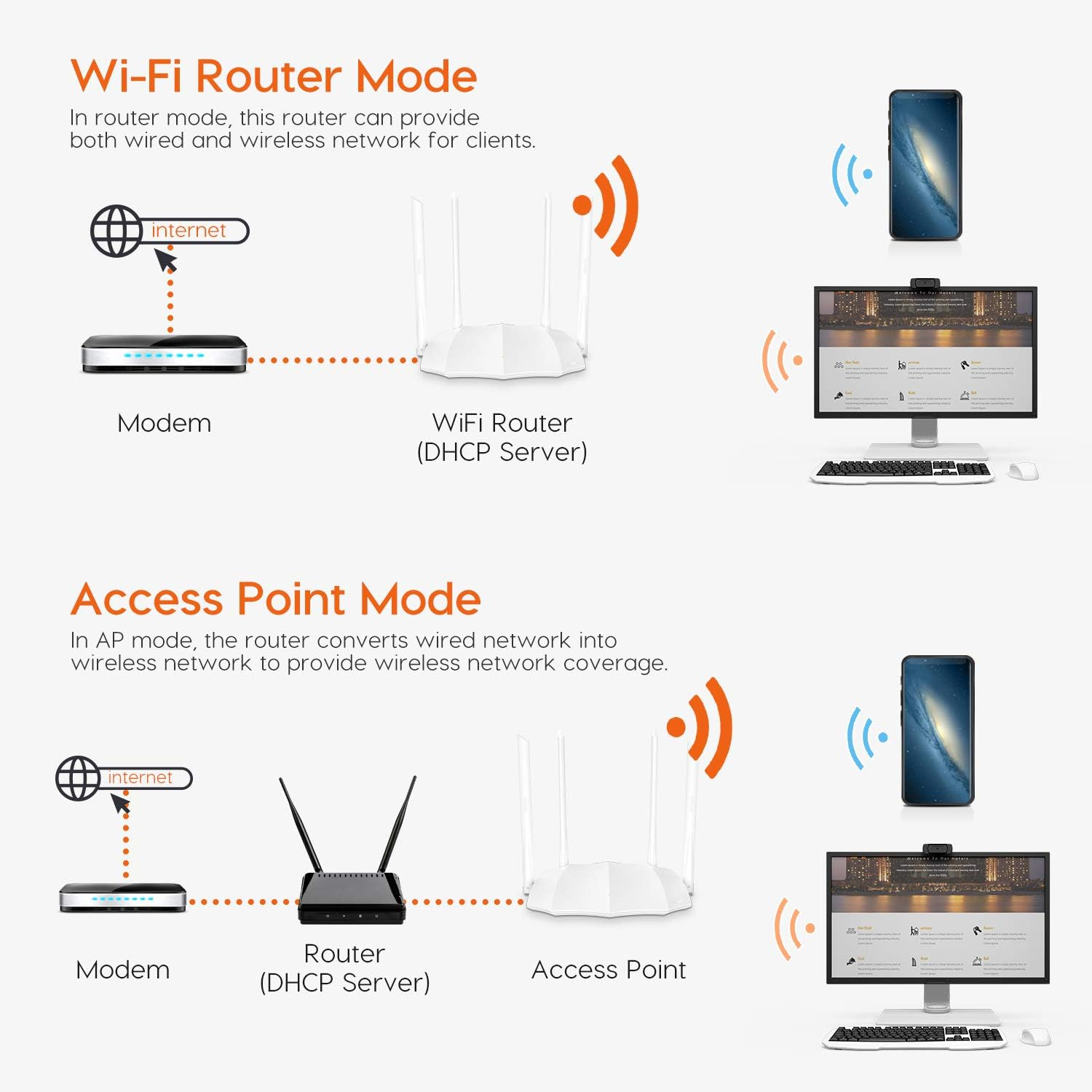 - Router Mode:Converting wired network to WiFi, sharing your internet with all families